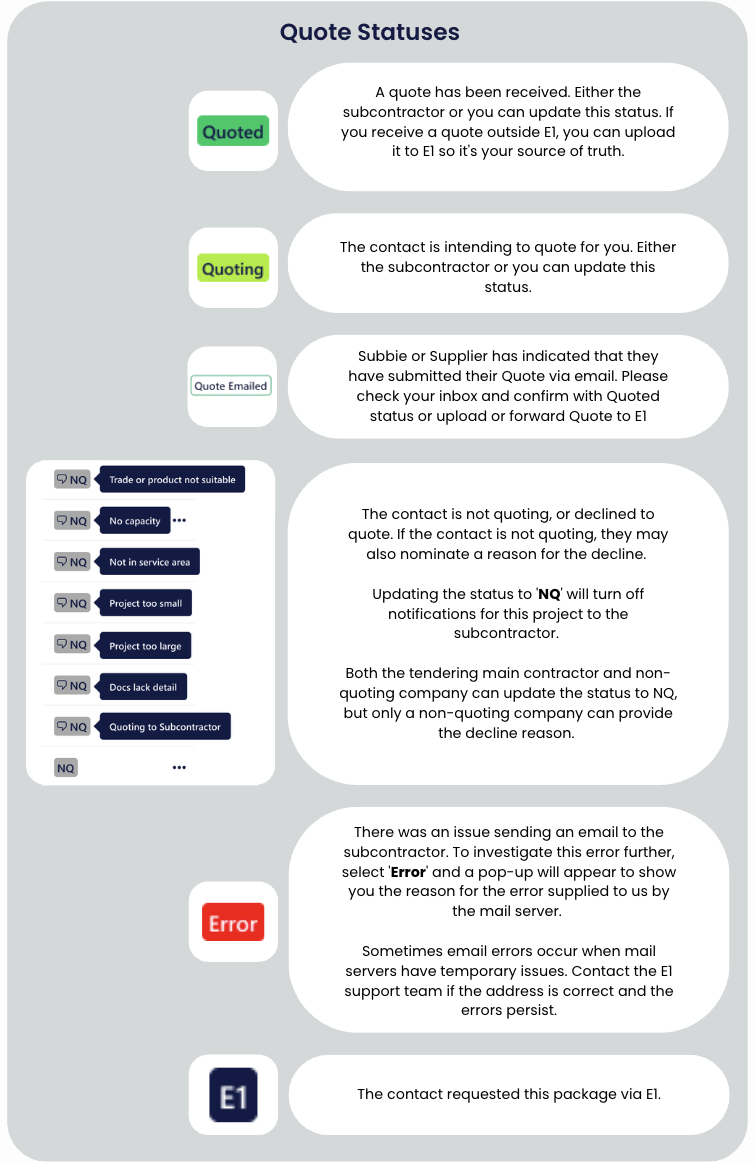 When a subcontractor downloads their package or responds to your enquiries, this page will automatically update. You’ll see their intention highlighted in the Quote Status column. Any subbies or suppliers that have indicated that they are not quoting may also nominate a reason for the decline to quote. Hovering over the ‘NQ’ status will reveal their nominated reason.