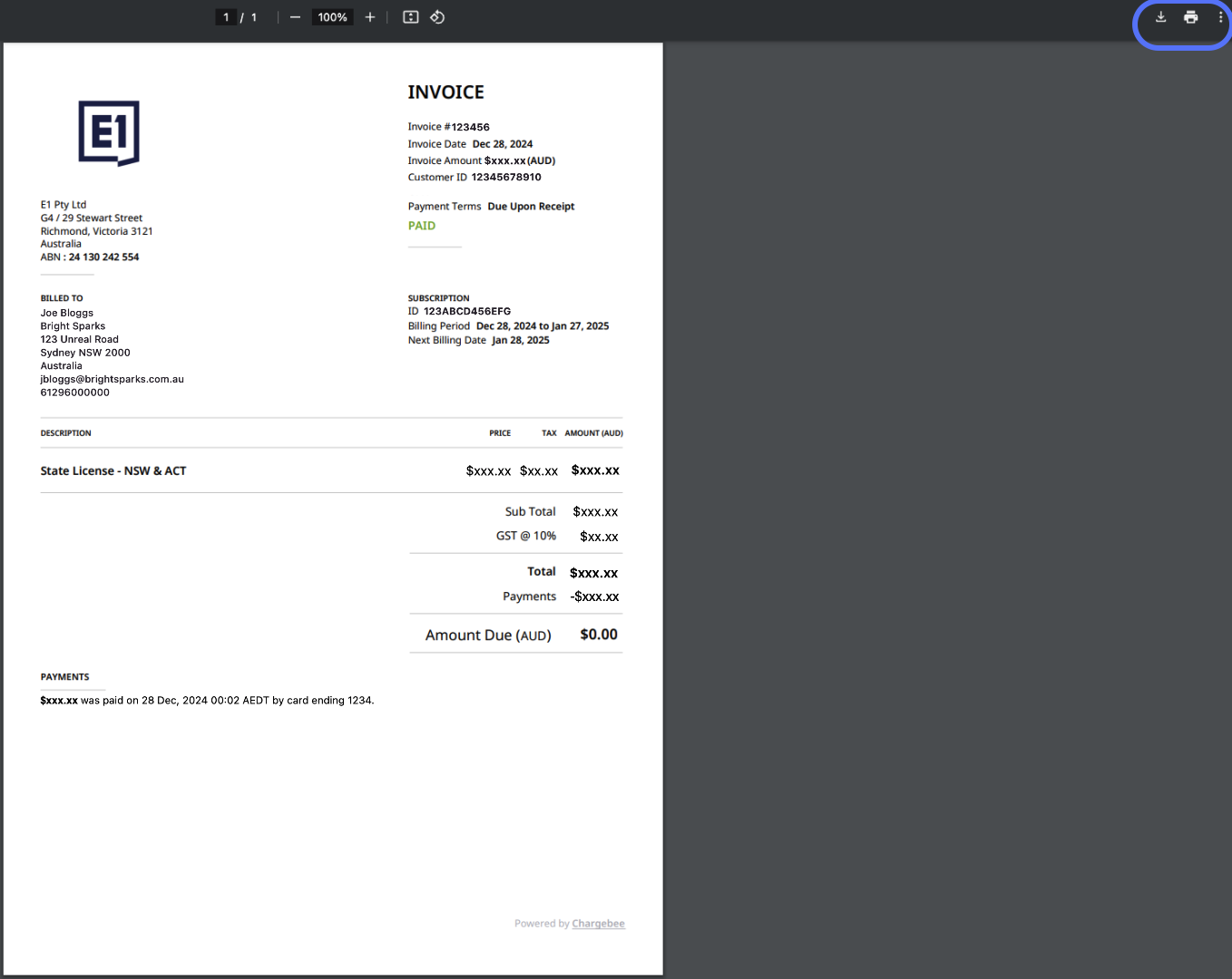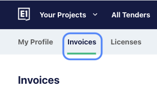 All E1 subscription invoices are located in Settings - Invoices (located within the top right dropdown menu).
