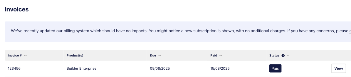 - Downloading: Click the ‘View’ button to open the invoice in a new tab to save, print, or download.