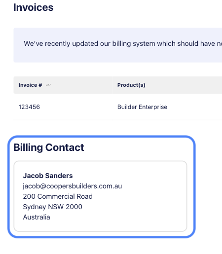 - 45-Day Reminder: You will receive an automated renewal reminder email 45 days before your subscription is set to expire, this will be sent to the nominated Billing Contact on your account. If you’re not sure who is listed as the billing contact, scroll to the bottom of the Invoices page and the details will be displayed.
